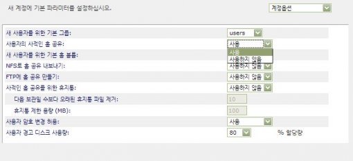 조건 2 - 만족. 관리 웹 페이지 좌측 [보안] 메뉴의 ‘사용자 및 그룹 계정’을 선택하고 좌측 상단의 드롭다운 메뉴에서 ‘계정옵션’을 클릭한다. 아래 설정 옵션 중 ‘사용자의 사적인 홈 공유’ 설정을 ‘사용’으로 지정한다. 이제 사용자마다 고유의 폴더를 각각 갖게 된다.