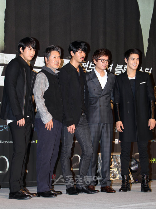 배우 정우성, 유동근, 차승원, 김민종, 최시원(왼쪽부터)이 30일 오전 서울 광진구 광장동 워커힐호텔 무궁화홀에서 열린‘아테나: 전쟁의 여신(제작 (주)태원엔터테인먼트/ (주)에이치플러스커뮤니케이션))' 제작발표회에서 포즈를 취하고 있다.
