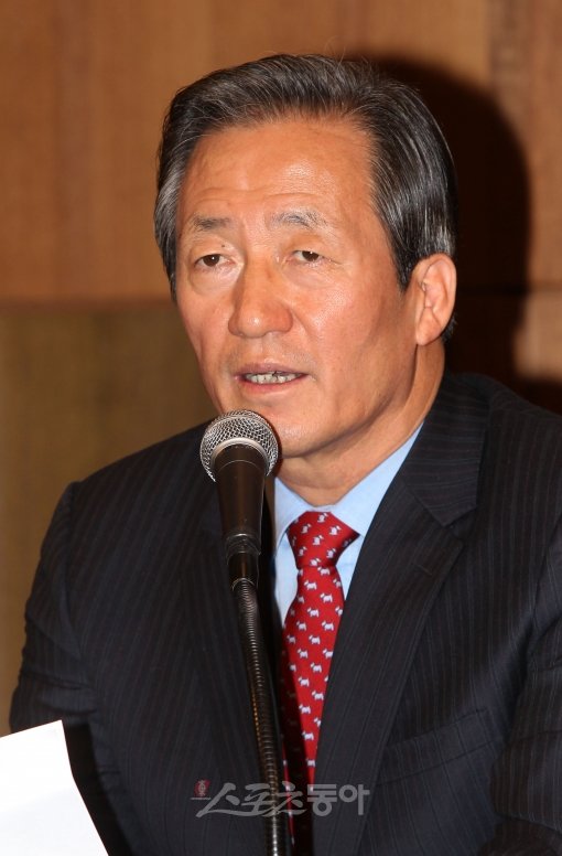 정몽준 대한축구협회 명예회장이 5일 오후 서울 중구 장충동 신라호텔 영빈관 루비룸에서 열린 기자회견에서 인사말을 하고 있다.