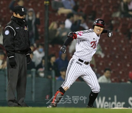 1일 서울 잠실야구장에서 열린 '2011 프로야구' 넥센 히어로즈와 LG 트윈스의 경기에서 6회말 1사 만루상황에서 LG 이진영이 싹쓸이 우중간 3루타를 치고 환호하고 있다.