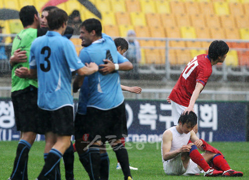 10일 오후 경기도 수원월드컵경기장에서 제5회 수원컵 국제청소년(U-20) 축구대회 대한민국과 우루과이의 경기가 열렸다. 1대 1로 무승부를 기록해 수원컵대회 3등을 한 대한민국 선수들이 경기 종료 후 아쉬워하고 있다.