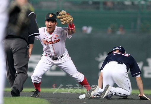 1일 인천 문학야구장에서 열린 프로야구 두산 베어스와 SK 와이번스의 경기에서 6회초 두산 공격, 2사 1루 주자 두산 오재원이 김동주 타석 때 2루 도루에 실패하고 있다.