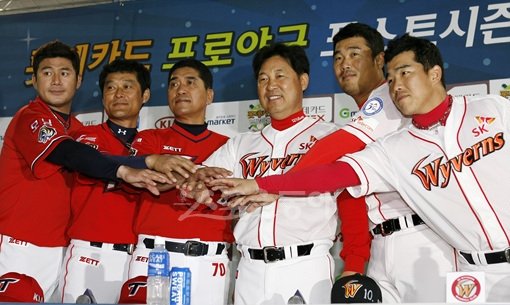 프로야구 준플레이오프 미디어데이가 7일 인천 문학구장 1루 내야 1층 로비 특별무대에서 열렸다. 양팀 감독과 선수들이 손을 맞잡고 포토타임을 갖고 있다. KIA 서재응, 이종범, 조범현 감독, SK 이만수 감독대행, 이호준, 정근우(왼쪽부터)