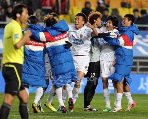 23일 수원월드컵경기장에서 열린 2011 K리그 챔피언십 준플레이오프 수원삼성 대 울산현대 경기에서 승부차기 끝에 승리를 확정지은 울산현대 선수들이 환호하고 있다.
