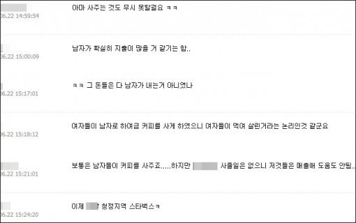 또한 한 네티즌은 “무슨 여성들이 스타벅스를 키웠느냐. 남성들이 여성들 사주느라 남성 소비가 더 컸는데”라고 일침을 가했습니다.