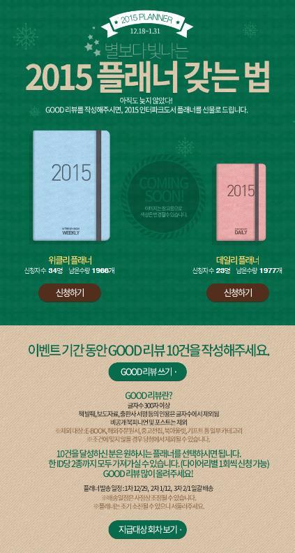 인터파크도서(book.interpark.com)가 1월 31일까지 책 리뷰 10건을 작성한 고객에게 2015년 플래너를 무료로 제공하는 ‘별보다 빛나는 2015 플래너 갖는 법’ 이벤트를 진행한다.
