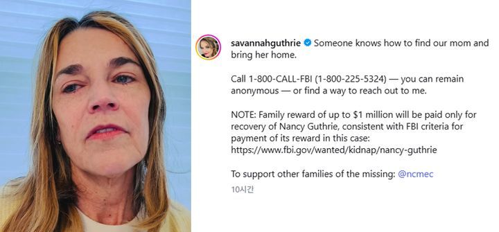 미국 NBC ‘투데이’ 앵커인 서배너 거스리는 24일(현지시간) 자신의 인스타그램에 4분 가량 길이의 영상을 올려 “애리조나 투손 자택에서 납치된 것으로 추정되는 어머니를 그리워하고 있다”며 이같이 밝혔다.