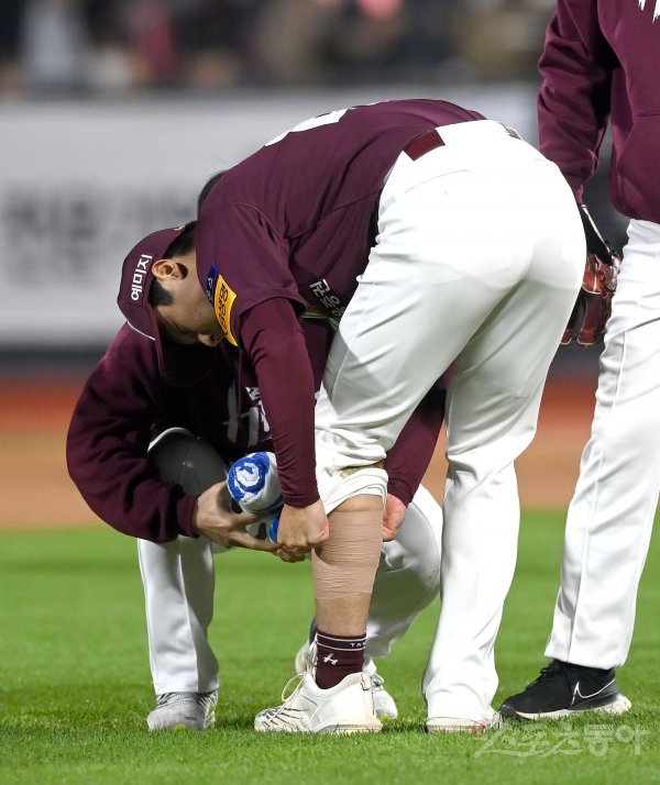 20일 수원KT위즈파크에서 ‘2022 신한은행 MY CAR KBO리그’ 준플레이오프 4차전 키움 히어로즈와 KT 위즈 경기가 열렸다. 6회말 무사 키움 김동혁이 타구에 맞은 후 응급처치를 받고 있다.