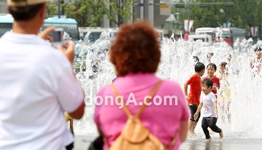 서울 낮 기온이 31도 까지 오른 20일 오후 서울 광화문광장 분수대에서 한 어린이가 더위를 식히고 있다.