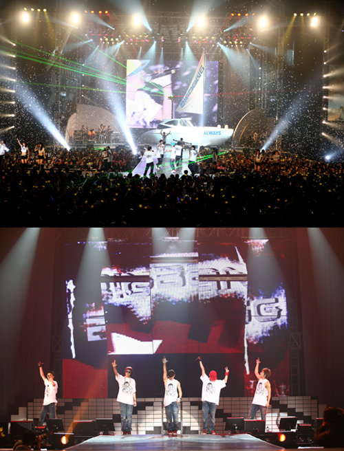 5인조 힙합 그룹 빅뱅이 최고의 한해를 만든 2007년을 보내기 싫다고 아쉬움을 드러냈다. 지난해 8월에 데뷔한 빅뱅은 미니음반 두 장의 연이은 대박으로 2007년 최고의 스타로 떠올랐다. 빅뱅은 28일 오후 8시부터 3시간동안 서울 올림픽공원 펜싱경기장에서 ‘빅뱅 이즈 그레이트(Bigbang is Great)’ 단독 콘서트를 열고 5000여 팬들과 함께 호흡했다. 히트곡 ‘거짓말’과 ‘마지막 인사’로 각종 온라인 차트에서 1위를 휩쓴 빅뱅은 “2007년은 보내기 싫은 해”라며 “2008년을 맞이하는 게 두려울 정도” 감격스러워 했다. 이어 “데뷔한 이래 이렇게 바빠 본적이 없다. 지난 한 달간은 세 시간 이상 잠을 자본 적이 없다. 더 바쁠 수 있게 여러분이 도와달라”고 부탁의 말을 전했다. ‘크레이지 독’ ‘환상속의 그대’ ‘라라라’ ‘거짓말’ ‘눈물뿐인 바보’등을 연달아 열창하며 무대를 압도했다. 이어진 무대에서는 화려한 퍼포먼스로 다양한 볼거리를 선사해 웃음과 박수갈채를 받았다. 또 공연 중간에 멤버들이 직접 준비한 콩트와 패러디물을 선보였다. 특히 ‘쇼를 하라’라는 카피의 광고와 드라마 ‘커피 프린스 1호’, ‘이명박의 BBK논란’ 등을 패러디 해 큰 웃음을 선사했다. 장장 3시간이 넘는 공연을 팬들과 함께 뛰며 즐긴 빅뱅은 “팬 여러분이 있어 우리도 있는 것”이라며 감사의 말을 전하고 마무리 했다.스포츠동아 이정연 기자 annjoy@donga.com 빅뱅은 내년 1월 중순부터 후소곡 ‘바보’로 활동하며 내년 1월에는 일본에서 음반도 발매할 계획이다. 스포츠동아 이정연 기자 annjoy@donga.com [화보]‘마린보이’ 박태환 기자회견 및 훈련 공개