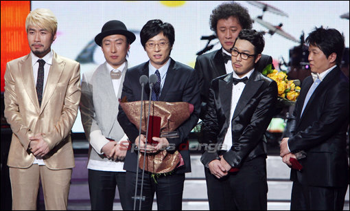 “이순재, 무한도전팀 전원!” MBC 2007 방송연예대상 시상식에서 대상 수상자가 7명이나 뽑혔다. 이 시상식에서 대상 공동수상자가 나온 것은 이번이 처음이다. 29일 밤 서울 여의도 MBC 공개홀에서 열린 2007 방송연예대상 시상식에서 ‘거침없이 하이킥’의 이순재와 유재석 박명수 정준하 정형돈 하하 노홍철 등 무한도전 출연자 6명 전원이 대상 수상자로 호명됐다. ‘야동순재’로 노익장을 과시한 이순재의 활약과 멤버 누구도 뺄 수 없는 ‘무한도전’ 팀에게 골고루 상을 준 것이다. 당초 강호동과 유재석의 2파전이 예상됐으나 뜻밖에 풍성한 선물이 쏟아졌다. 유재석은 지난해 수상자였고 강호동은 전날 SBS에서 대상을 받는 등 두 사람의 경쟁은 불가피했다. 시상자로 나선 윤은혜가 “혼자라 떨린다”며 유재석을 시상자로 불러내면서 ‘이변’은 시작됐다. 강호동이 받을 경우 유재석이 비참해질 수 있었고 유재석이 수상할 경우 ‘뻔뻔한’ 상황이 연출될 수 있었다. MC 이혁재가 두 사람을 직격 인터뷰하면서 경쟁 구도를 극한으로 몰고 가기도 했다. 윤은혜가 먼저 “이순재”를 외칠 때 유재석의 표정이 잠시 굳어졌으나 뒤이어 무한도전팀 전원이 호명되자 얼음장처럼 굳어버렸다. 유재석은 이경규, 김용만, 강호동, 김제동, 김원희 등 동료 연예인과 ‘무한도전’ 김태호 PD 등에게 일일이 고마움을 표시한 뒤 “이런 얘기는 처음하지만 저를 아껴주고 사랑하는 제 여자친구 나경은 씨에게 감사드린다”고 말했다. 박명수도 “장동건보다 잘 생겼다고 말해준 여친에게 고맙다”며 애정을 과시했다. ‘1인자’ 유재석의 수상을 예상했던 무한도전 멤버들은 감격의 눈물을 감추지 못했다. 특히 정준하는 “올해 안 좋은 일에 휘말려서 마음 아팠는데”라며 연신 눈시울을 훔쳤다. 다음은 수상자 명단 ▲코미디시트콤 부문 최우수상=나문희 ▲쇼버라이어티 부문 최우수상=조형기 김제동 ▲코미디시트콤 부문 남녀 우수상=엄기준 조원석 양희성 ▲쇼버라이어티 부문 남녀 우수상=김구라 현영 ▲코미디시트콤 부문 남녀 신인상=정일우 오정태 박민영 이국주 ▲쇼버라이어티 부문 남녀 신인상=우승민 박신혜 ▲아나운서상=오상진 서현진 ▲시청자가 뽑은 최고 프로그램상=무한도전 ▲인기상=박해미 최민용 김원희 ▲PD상=이경규 김용만 ▲우정상=박명수 ▲공로상=신구 송윤아 김상호 ▲특별상=신지 김병욱PD 정복기PB ▲작가상=최대웅 이현주 주기쁨 ▲베스트커플상=조원석 양희성 스포츠동아 정기철 기자 tomjung@donga.com 사진=양회성 인턴 기자 yohan@donga.com