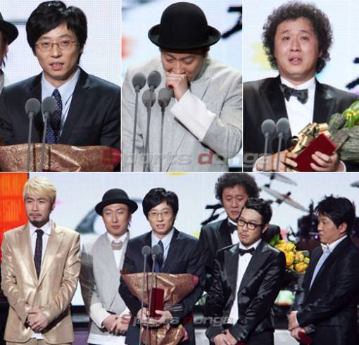 2007 MBC ‘방송연예대상’의 주인공은 올 한해 무한 사랑을 받은 버라이어티쇼 ‘무한도전’과 거침없는 지지를 받은 시트콤 ‘거침없이 하이킥’(이하 ‘하이킥’)이었다. 대상부터 ‘하이킥’의 지주 이순재와 ‘무한도전’여섯 멤버가 나란히 수상하는 ‘파격’이 벌어졌다. ‘무한도전’은 6개의 대상 트로피와 우정상, 작가상, 시청자가 뽑은 최고 프로그램상까지 9개의 트로피를 휩쓸었다. ‘하이킥’ 또한 대상 이순재를 비롯, 코미디시트콤 부문 최우수상 나문희, 코미디시트콤 부문 남녀 신인상에 정일우 박민영, 인기상에 박해미 최민용, 특별상에 신지 김병욱PD 등이 수상해 6개 부문 8명의 수상자가 반짝이는 트로피를 거머쥐었다. 하지만 두 팀의 공동 ‘무더기 대상’은 사상 초유의 반전. 강호동의 2연승과 유재석의 2연패 사이로 예상됐던 ′유 vs 강 2파전′에서 다소 힘이 빠지는 결과일 수도 있는 것. 뜻밖의 대상을 선물로 받은 ′무한도전′ 나머지 5명의 멤버들은 어리둥절 할 수 밖에 없었다. 결국 평소 잘 웃거나 눈물을 흘리지 않기로 유명한 ′거성′ 박명수와 올 한해 ′접대부 술집 운영 논란′에 휩싸여 하차 공론화가 일었던 정준하는 소감을 밝히는 마이크 앞에서 굵은 눈물을 흘렸다. 다음은 수상자 명단 ▲대상=이순재 유재석 박명수 정준하 하하 노홍철 정형돈 ▲코미디시트콤 부문 최우수상=나문희 ▲쇼버라이어티 부문 최우수상=조형기 김제동 ▲코미디시트콤 부문 남녀 우수상=엄기준 조원석 양희성 ▲쇼버라이어티 부문 남녀 우수상=김구라 현영 ▲코미디시트콤 부문 남녀 신인상=정일우 오정태 박민영 이국주 ▲쇼버라이어티 부문 남녀 신인상=우승민 박신혜 ▲아나운서상=오상진 서현진 ▲시청자가 뽑은 최고 프로그램상=무한도전 ▲인기상=박해미 최민용 김원희 ▲PD상=이경규 김용만 ▲우정상=박명수 ▲공로상=신구 송윤아 김상호 ▲특별상=신지 김병욱PD 정복기PB ▲작가상=최대웅 이현주 주기쁨 ▲베스트커플상=조원석 양희성 스포츠동아 이유나 기자 lyn@donga.com 사진=양회성 인턴 기자 yohan@donga.com