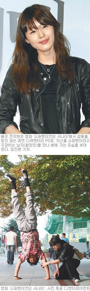 “더 잘한 부분이 많이 있었는데, 오늘 완성된 영화를 처음으로 보니 많이 잘렸네요. 아까 감독님을 툭툭 치면서 ‘왜 자르셨어요?’ 했어요.” 감정을 억누르려고 노력했겠지만, 전지현은 살짝 화가 난 것처럼 보였다. 더 좋은 모습을 보여 줄 수 있었는데 아깝다는 듯이. 영화에 대한 기대와 욕심이 만만치 않다. 영화 ‘슈퍼맨이었던 사나이’(31일 개봉)가 처음 공개된 21일, ‘말아톤’의 정윤철 감독이 연출하고 남자 배우 중 가장 주가를 높이고 있는 황정민이 출연했지만 사람들의 관심은 전지현에게 쏠렸다. 스타이긴 해도 ‘엽기적인 그녀’의 이미지나 ‘CF 퀸’의 굴레에서 벗어나지 못했던 그다. 최근 일본 애니메이션을 실사로 만든 홍콩 일본 프랑스 합작 영화 ‘블러드 더 라스트 뱀파이어’의 촬영을 마치고 세계 시장에 진출할 채비를 갖춘 그는 이 영화가 먼저 개봉되면서 2년 만에 국내 관객의 평가를 받게 됐다. “딱 최선을 다한 만큼, 그 이상도 이하도 아닌 결과가 나온 것 같아요. 그렇다고 제가 전작에서는 열심히 안 했다는 얘기는 아니지만, 이번엔 내공이 깊은 배우(황정민)와 함께한 데다, 감독님이 길을 알려 주시고 제가 ‘아, 이렇게 걸을 수도 있구나’ 하고 느끼며 배우로서 성숙해지는 계기가 됐어요. 하지만 결과는 관객들의 몫이죠.” ‘슈퍼맨이었던 사나이’의 홍보도 ‘배우로서의 전지현을 보여 주겠다’에 집중됐다. 전지현이 앞머리를 잘랐다, 다큐멘터리 PD를 연기하기 위해 화장기 없는 얼굴로 분투했다, ‘건강 제일주의자’인데 금연초와 저타르 담배로 골초 연기를 했다는 등 여러 소식이 연일 인터넷에 올랐다. 대본에는 욕도 많이 나왔지만 설날 개봉하는 가족 영화로 ‘전체 관람가’를 맞추기 위해 많이 고쳤다고 했다. 전지현은 자신이 슈퍼맨이라 믿고 있어 연기에서 ‘오버’를 해야 하는 황정민 옆에서 삶에 찌든 냉소적 성격의 다큐멘터리 PD 역할을 무난하게 해냈다. 정말 몰랐다. 전지현의 얼굴에 주근깨가 그렇게 많은 줄. “촬영장에서 유행어가 있었는데요. 예를 들어 ‘완전 맛있어’ 하면 ‘완맛’. 그 방식으로 표현하면 지금은 ‘완후(완전 후회)’. 하하. 후회하면서도 그렇게 연기했기 때문에 감정이 거짓 없이 진심으로 다가오는 것 같아요. 화면에서만 볼 수 있는, 제가 지금까지 많이 보여 드렸던 모습으로 저런 감정을 표현한다면 느낌이 달랐겠죠.” 그는 메이크업에 관심이 없어 평상시에도 잘 안 하고 다닌다며 여배우들은 관객들이 생각하는 것처럼 맨얼굴을 두려워하지 않는다고 덧붙였다. “워낙 예쁜 분들이 많으니까요. 앗, 그렇다고 제가 예쁘다는 건 아니고요….” 이 영화는 세상을 바꾸는 것은 슈퍼맨뿐 아니라 누구나 할 수 있는 일이라고, 모두 슈퍼맨이 될 수 있다고 말한다. 이 영화로 인해 슈퍼맨의 정의가 바뀌었으면 하는 것이 전지현의 소망이다. “슈퍼맨이 되기 위해 노력하는 게 있냐고요? 부끄럽지만 지금은 없네요. 그러나 노력해야 한다는 마음을 얻었어요. 그런 것들을 모르고 살다가 이제 변해야 되겠다는 생각을 하기 시작한 거죠. ‘시작이 반’이잖아요?” 채지영 기자 yourcat@donga.com ■ 영화 ‘슈퍼맨이었던 사나이’는… 다큐 女PD와 자신을 슈퍼맨으로 믿는 남자 이야기 작가 유일한의 동명 단편소설을 스크린으로 옮긴 작품이다. 감동을 싫어하지만 시청률을 위해서는 조작도 서슴지 않는 휴먼 다큐멘터리 PD 송수정(전지현)이 자신을 슈퍼맨이라고 믿는 남자(황정민)를 취재하면서 그에게 동화되는 이야기. 재미있는 소재로 경쾌하게 시작했는데, 뒤로 갈수록 늘어진다. 나중에 밝혀지는 슈퍼맨의 과거 사연은 인위적인 감동에서 벗어나지 못한다. 선한 의도를 갖고 선하게 만든 영화인 줄 알지만 그 ‘선함’이 지나친 데다 세련미가 떨어진다. 114분짜리 공익 광고를 보는 느낌이다. 처음부터 끝까지, ‘남을 도와야 하고 그것은 매우 기분이 좋은 일이며 지금 북극이 녹고 있으니 우리는 지구를 지켜야 하고 현재를 바꾸면 미래가 바뀐다’는 말을 수도 없이 반복한다. 대사로, 전광판의 자막으로, 내레이션으로 다양하게 관객의 머릿속에 꼭꼭 주입시킨다. 진정한 감동을 주기엔 말이 너무 많다. 다 보고 나서 든 생각. ‘알았어, 알았다고!’ [화보]‘청순+건강 미인’전지현 컬렉션