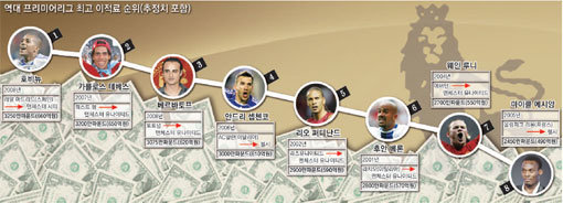 태국 총리 출신 구단주 탁신 친나왓 대신 아랍에미레이트연합(UAE) 투자그룹인 아부다비 컨소시엄으로 주인이 바뀐 맨시티는 스페인 프리메라리가 레알 마드리드에 3250만파운드(약 660억원)를 주고 호비뉴(24)의 깜짝 이적을 성사시켰다. 막강 오일달러를 등에 업은 맨시티는 내년 1월 이적시장에서도 크리스티아누 호날두(23)의 영입을 위해 1억3500만파운드(약 2735억원)를 준비한다고 공개적으로 밝히는 등 앞으로도 슈퍼스타 영입을 멈추지 않을 기세다.