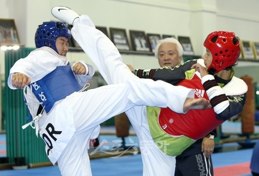 훈련의 시작은 스트레칭. 첫 번째 과제는 소위 ‘다리 찢기’다. 김용수 코치는 “골반이 유연해야 발차기를 잘 한다”고 했다. 4년 전 문대성(190cm)이 자기보다 큰 알렉산드로스 니콜라이디스(201cm·그리스)의 얼굴을 가격할 수 있었던 것도 바로 유연한 골반 덕분.