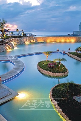 바다와 하늘이 연결된 듯한 느낌을 주는 인피니티 풀장은 하늘에서 수영하는 듯한 착각을 준다. PIC 괌이 가족들을 위한 최고의 물놀이 시설을 갖추고 있다면 이곳 풀장은 어른들을 위한 최고의 놀이터다.