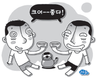 그래서 제 친구가 “야 우리 그만 마시자. 이거 일꾼들 줘야 혀. 이러다 우리 아부지한테 걸리면 혼난단 말이여∼” 하면서 말렸지만 이미 알딸딸해진 저는 친구의 만류도 듣지 않고, 제 아버지가 예전에 하셨던 것처럼 막걸리를 한 사발 쭉∼ 들이켰습니다. 한 모금 정도 남았을 때, 바닥에 쫙 뿌리며 ‘캬 시원하다!’를 외쳤던 겁니다.