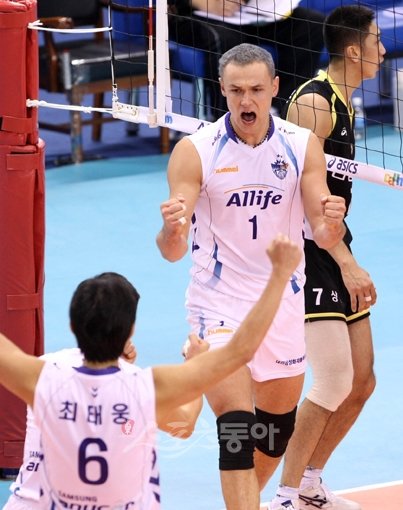 삼성화재 블루팡스는 27일 대전 충무체육관에서 열린 프로농구 NH농협 2008~2009 V-리그 3라운드 LIG손해보험과의 경기에서 올 시즌 남자부 첫 트리플크라운을 기록한 안젤코의 활약에 힘입어 3-0(25-23 25-16 25-21) 완승을 거뒀다.