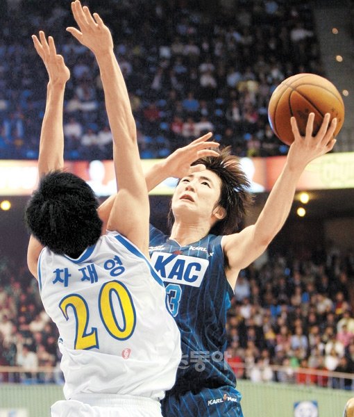 22일, 잠실실내체육관에서 열린 삼성과 KCC의 챔피언결정전. 부상에서 회복한 KCC의 ‘꽃 남’ 강병현(오른쪽)이 삼성 차재영의 강력한 수비 때문에 얼굴을 찌푸리며 골밑슛을 시도하고 있다.