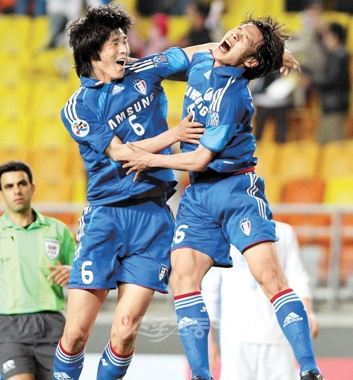 “시즌 첫골 꿀맛이야” 수원 배기종(오른쪽)이 역전 결승골을 터뜨린 후 동료 박현범과 함께 공중으로 뛰어오르며 환호하고 있다.
