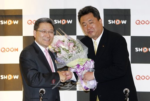 “잘해봅시다” 24일, 서울프라자호텔에서 열린 기자회견에서 부산 KTF 전창진(오른쪽) 신임감독이 서유열 구단주대행으로부터 꽃다발을 받고 있다.