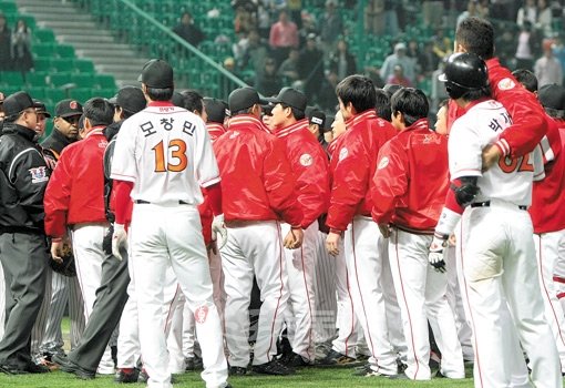 23일 롯데-SK전에서 발생한 벤치 클리어링과 관련, SK를 성토하는 목소리가 크다. 큰 점수차로 이기고 있을 때도 상대를 봐주지 않는 비정함, 사소한 일에도 ‘사과’보다는 ‘논리’를 앞세우는 면들이 SK가 ‘공공의 적’이 돼 버린 이유로 꼽힌다.