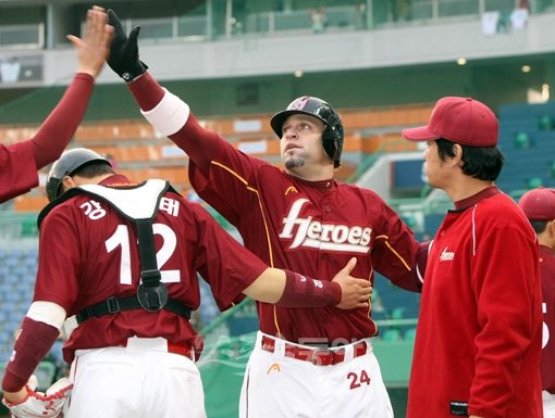 브라보 브룸바 2홈런에 5타점. 침묵하던 히어로즈 브룸바(가운데)가 터졌다. 문학 SK전 1회 좌월2점홈런을 친 브룸바가 덕아웃으로 들어와 하이파이브를 나누고 있다.
