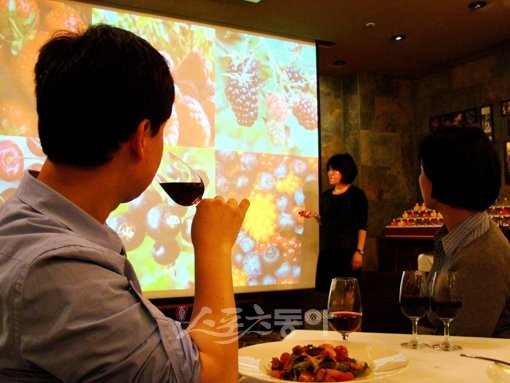 김새길 부원장이 레드 와인을 만드는 다양한 포도 품종을 대형 화면을 통해 보여주는 가운데 스포츠동아 이길상기자(왼쪽)가 이날 설명 들은 와인을 시음하고 있다.
