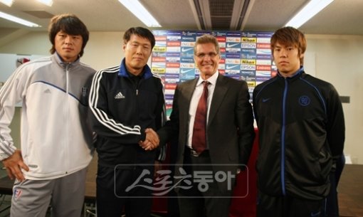 수원 삼성의 곽희주, 차범근 감독, 가시마 앤틀러스의 오스왈드 올리베이라 감독, 이노하 마사히코(왼쪽부터)가 4일 열린 AFC 챔피언스리그 기자회견을 마친 뒤 선전을 다짐하며 기념촬영하고 있다. 사진제공 | 수원 삼성