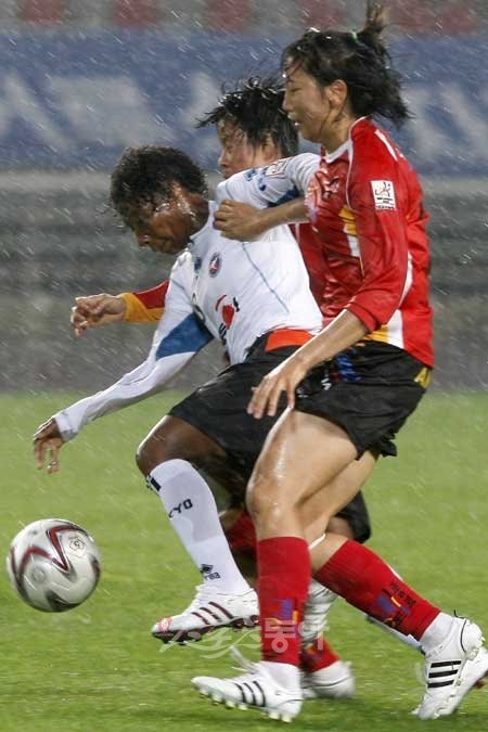 빗속의 삼바. 여자축구 첫 용병인 대교의 쁘레치냐(왼쪽)가 11일 고양 종합운동장에서 열린 서울시청과 2009 WK리그 경기에서 상대 수비수 2명을 뿌리치며 드리블 돌파를 시도하고 있다.
