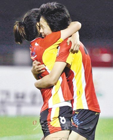 승자의 포옹 서울시청 정원정(오른쪽)이 WK리그 수원시시설관리공단과의 경기 후반 인저리 타임에 결승골을 넣은 뒤 동료 정세화를 끌어안고 기뻐하고 있다. 수원 | 양회성 기자 yohan@donga.com