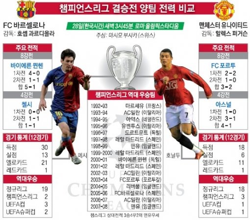 ‘꿈의 무대’ 2008-2009유럽축구연맹(UEFA) 챔피언스리그 결승전이 28일 오전 3시45분(한국시간) 이탈리아 로마 올림픽스타디움(스타디오 올림피코)에서 벌어진다. 맨체스터 유나이티드는 챔피언스리그 통산 4회 우승에 도전하고, FC바르셀로나는 3번째 영광을 위해 뛴다. 최고의 클럽을 놓고 논쟁을 벌여왔던 맨유와 바르셀로나. 이번 ‘전쟁’에서 승리하는 팀은 ‘역대 최강 클럽’이라는 영광의 칭호도 얻게 된다.○호날두 VS 메시