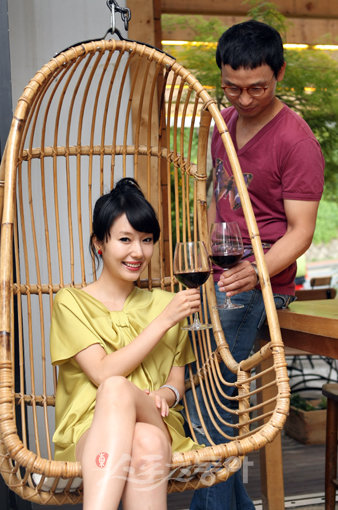 성공을 위하여…대나무 흔들의자에서 편안한 자세를 취한 이정현(왼쪽)의 앨범 성공을 빌며 와인으로 건배를 한 김원겸 기자. 김종원 기자 won@donga.com