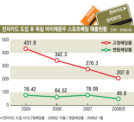 상품별로 살펴보면 우리나라의 프로토 게임과 같은 형태로 운영되는 고정배당률 게임(오드셋) 상품의 경우 2005년 4억3180만 유로였던 발매액이 2008년에는 2억780만 유로로 무려 51.9%%나 하락했다. 2008년 1월부터 전자카드제를 시행한 변동배당률 방식 게임(토토 방식)은 2007년 781만 유로에서 2008년 498만 유로로 불과 1년 만에 36.5%%의 감소율을 보였다. 독일의 경우 1인당 한주 동안 베팅할 수 있는 금액이 4000유로(약 700만원)로 우리나라보다 훨씬 높은 수준임을 고려하면 전자카드제 도입이 매출 감소에 결정적 역할을 한 것으로 분석된다. 전자카드제 의무화 이후 고액 베팅하는 사람이 줄어드는 등 일부 긍정적 효과가 나오기도 했지만 기존 참여인원의 상당수가 전자카드 없이도 자유롭게 이용할 수 있는 해외 스포츠베팅 사이트나 불법 사설 베팅시장으로 흘러들어가는 심각한 부작용을 낳고 있다.