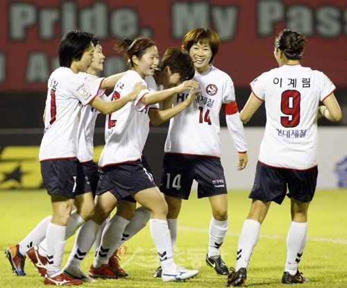 철녀들의 V환호 현대제철 김주희(오른쪽 3번째)가 8일 수원종합운동장에서 열린 대교눈높이 2009 WK리그 서울시청과의 경기에서 페널티킥 결승골을 넣은 뒤 동료들에 둘러싸여 기쁨을 나누고 있다. 수원 | 양회성 기자 yohan@donga.com