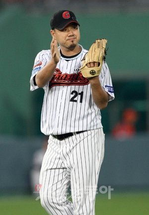 2009 프로야구 롯데자이언츠 대 한하이글스 경기가 10일 부산 사직야구장에서 열렸다. 5회초 무사 1루 한화 송광민의 보내기 번트가 내야 플라이 되자 롯데 1루수 이대호가 고의로 볼을 놓친 후 1루로 송구해 아웃시킨 후 1루주주 이영우도 2루에서 아웃되자 송승준이 박수를 치고 있다. 사직 | 김종원기자 won@donga.com