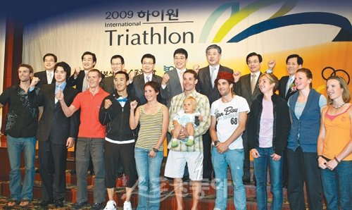“개회를 선언합니다” 2009 하이원 국제트라이애슬론대회 개회식을 마친 뒤 내외빈과 선수들이 힘차게 파이팅을 외치고 있다. 앞줄 맨 왼쪽부터 시계방향으로 송일국 대한트라이애슬론연맹 부회장, 유창식 정선군수, 유경선 아시아트라이애슬론연맹 회장, 최영 하이원리조트 사장, 김진선 강원도지사, 김재호 동아일보 사장, 최재규 강원도의회 의장, 김형배 하이원리조트 전무이사, 송대근 스포츠동아 대표.정선|서영수 동아일보 기자 kuki@donga.com