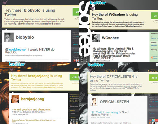 ‘피겨여왕’ 김연아가 몰고온 트위터 열기가 뜨겁다. 140자 단문서비스로 언제어디서든 손쉽게 이용할 수 있어 일반인들은 물론 스타들까지도 애용하는 추세다. 영어나 일어로 자신의 근황을 써내려감으로써 해외 현지팬들에게 더 친숙하게 다가갈 수 있어 해외진출을 이미 했거나 진출을 목표로 하는 스타들에겐 이만한 서비스가 없는 듯하다. (사진은 타블로, 소희, 세븐, 영웅재중의 트위터 메인 화면)