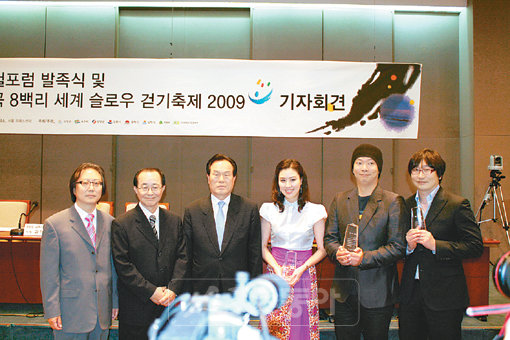 이성수 세계걷기운동본부 부회장, 정홍택 한국저작권단체연합회 이사장, 박재순 한나라당 최고위원과 ‘관동별곡 8백리 세계 슬로우 걷기 축제 2009’ 홍보대사인 아나운서 김성경, 개그맨 박준형, 최국(왼쪽부터)이 23일 서울 프레스센터에서 열린 ‘송강 정철 포럼’ 발족식에서 송강 정철을 한국의 문화 영웅으로 전 세계에 알리겠다며 다짐하고 있다. 사진제공 | 세계걷기운동본부