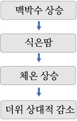 이때 증발하는 땀은 결국 체온을 높이고 신체는 외부의 온도를 낮은 것으로 받아들인다. 추위는 그렇게 느껴지며 결국 공포감으로 순간 더위를 잊게 되는 셈이다.