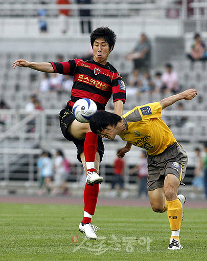 “비켜, 머리 다쳐.” 포항 유창현(왼쪽)이 볼을 걷어내려는 순간, 국민은행 돈지덕이 머리를 들이밀면서 볼을 가로채고 있다. 고양 | 임진환 기자 photolim@donga.com