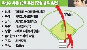 4회 중월 2루타를 터뜨린 추신수는 6회 2사 후 상대 선발 마크 벌리의 124km짜리 체인지업을 받아쳐 가운데 펜스를 넘기는 솔로아치를 뿜었다. 시즌 13호 홈런. 3타수 2안타 1타점을 기록한 그의 타율은 0.304로 뛰어 올랐고 타점은 54개를 마크했다.