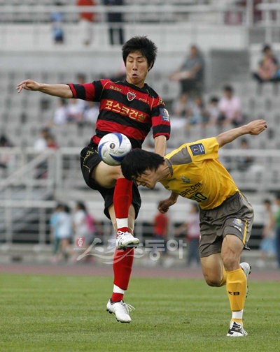 1일 고양종합운동장에서 열린 FA컵 16강전 고양 국민은행과 포항 스틸러스의 경기. 고양의 돈지덕과 포항의 유창현이 볼을 다투고 있다. 고양 | 임진환 기자 photolim@donga.com