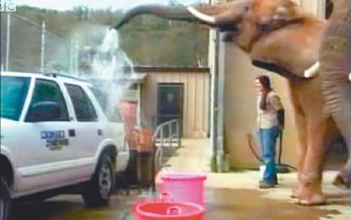 미국 오레곤주에 위치한 한 동물원은 코끼리들이 그 곳을 방문하는 사람들을 대상으로 세차를 하도록 하는 색다른 방법으로 인기를 끌고 있다고 한다. 코끼리 코로 해주는 세차를 받을려면 20달러만 내면 된다.