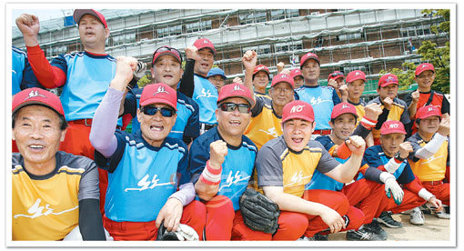 평균연령은 63세, 최고령은 78세. 이 공간에서는 50대 장년층도 청년취급을 받는다. 벗겨진 이마와 세월의 흔적이 녹아든 주름. 하지만 노노야구단의 유니폼을 입는 순간 이들은 슈퍼맨이 된다. 전영희 기자(아랫줄 왼쪽에서 4번째)와 함께 파이팅을 외치는 노노야구단.임진환 기자 photolim@donga.com