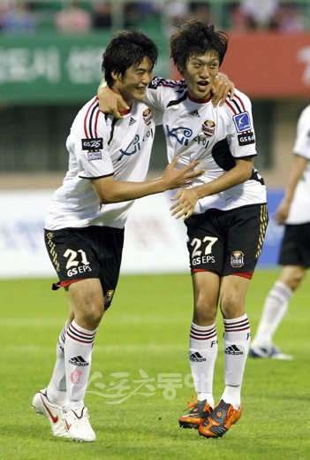 ‘아듀, K리그!’ 이변이 없는 한 한국 선수로는 7번째 잉글랜드 프리미어리거가 탄생할 전망이다. 볼턴 원더러스 이적을 사실상 확정한 이청용(오른쪽)이 K리그 고별 무대가 될 19일 강원 원정전에서 전반 종료직전 득점한 뒤 ‘절친 동료’ 기성용과 함께 기쁨을 나누고 있다.강릉 | 김종원 기자 won@donga.com