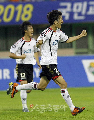 잉글랜드 프리미어리그 볼턴 원더러스로 입단이 유력한 FC서울 이청용이 19일 오후 7시 강원FC와의 K-리그 원정 경기에서 곽광선의 수비를 뚫고 전반 종료 직전 역전골을 성공시킨 후 환호하고 있다. 강릉 | 김종원기자 won@donga.com