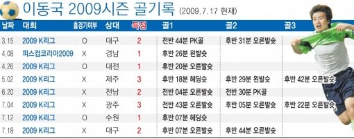 순도도 높다. 14차례 리그 경기에서 14골을 기록한 이동국은 페널티킥 1골을 뺀 전부를 필드골로 만들었다. 이 중 오른발로 10골을, 왼발로 한 골, 머리로 2골을 성공시켰다.