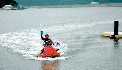 일본 후쿠오카에서 출발한 이토 가즈히코 씨는 대한해협을 건너 경남 진해까지 250 km가 넘는 거리를 자신의 수상오토바이로 건너 왔다.