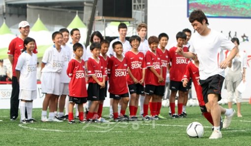 23일 서울시 한강 반포 공원에서 열린 자선 드림매치에서 맨체스터 유나이티드 박지성이 드리블 시범을 보이고 있다. 김종원기자 won@donga.com
